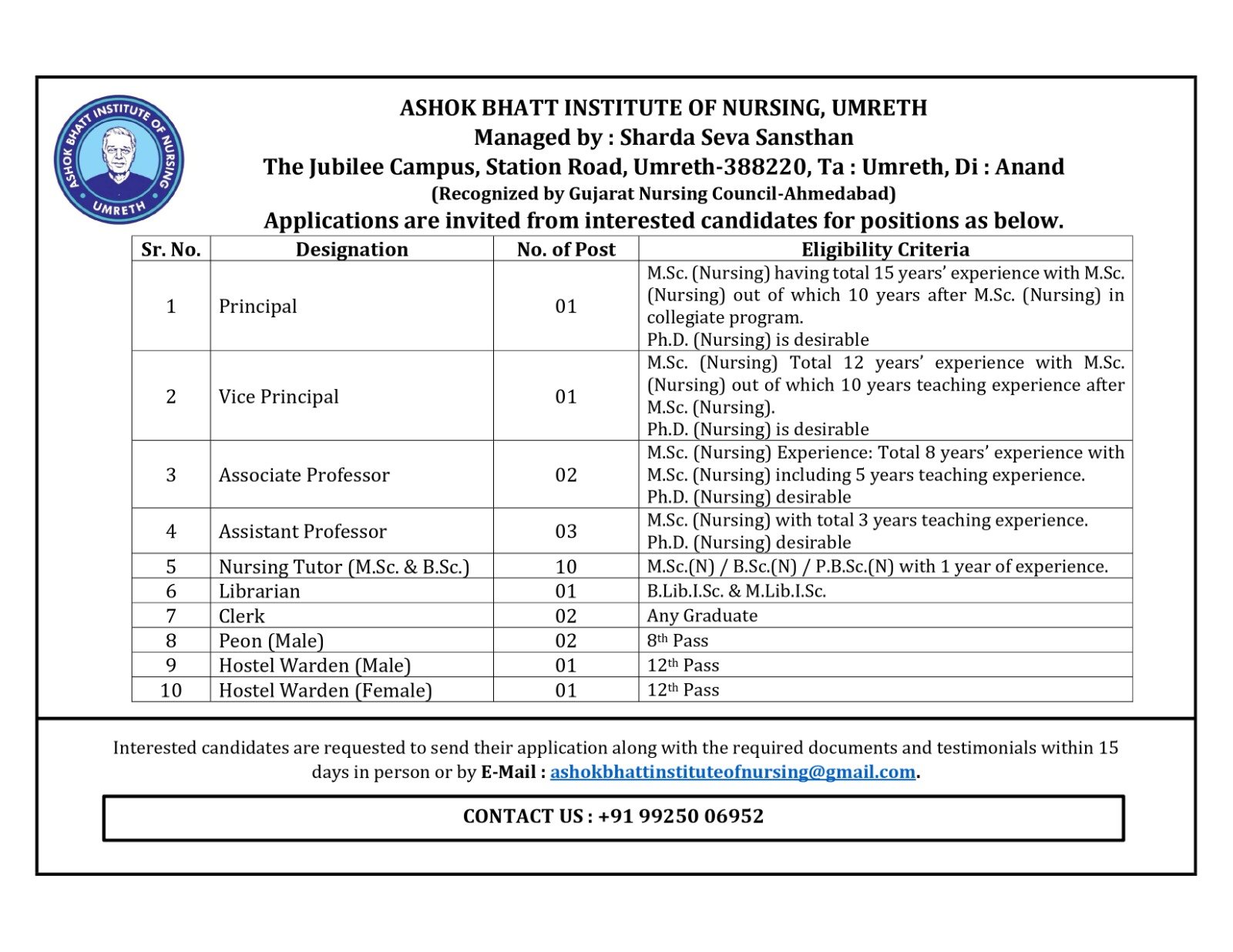 Ashok Bhatt Institute of Nursing Recruitment: અશોક ભટ્ટ ઇન્સ્ટિટ્યૂટ ઓફ નર્સિંગ, ઉમરેઠ (Sharda Seva Sansthan દ્વારા સંચાલિત) ગુજરાત નર્સિંગ કાઉન્સિલ, અમદાવાદ દ્વારા માન્ય સંસ્થા છે. સંસ્થા Jubilee Campus, Station Road, Umreth ખાતે કાર્યરત છે. સંસ્થામાં શૈક્ષણિક અને બિન-શૈક્ષણિક વિભાગોમાં ખાલી જગ્યાઓને ભરવા માટે લાયક, અનુભવી તથા રસ ધરાવતા ઉમેદવારો પાસેથી અરજીઓ આમંત્રિત કરવામાં આવે છે. નર્સિંગ શિક્ષણ ક્ષેત્રમાં કારકિર્દી બનાવવા ઇચ્છુક ઉમેદવારો માટે આ એક મહત્વપૂર્ણ તક છે.આ લેખમાં અમે પાત્રતા, પગાર, પસંદગી પ્રક્રિયા, અરજી પ્રક્રિયા અને અરજી ની પ્રકિયા વિશે સંપૂર્ણ વિગતે માહિતી આપીશુ.